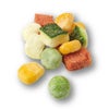 ●フリーズドライで仕上げた4つの野菜(ズッキーニ、エンドウ豆、トマト、とうもろこし)をミックスしたおやつです。