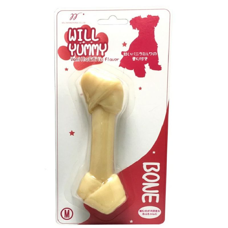 ■特長 ヤミーボーンは、甘いバニラとミルクのニオイがワンちゃんの興味をそそる犬用おもちゃです。 おもちゃを噛むことで歯垢や歯石がつきにくく、歯茎のマッサージになります。 硬い素材でできているので壊れにくく長持ちし、わんちゃんのストレス発散になります。
