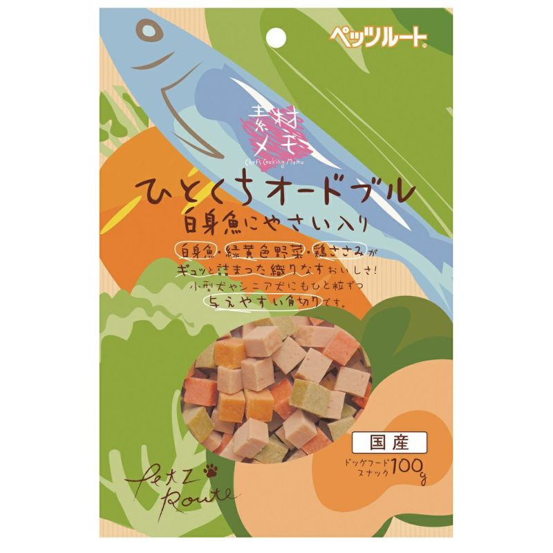 | 素材 | 小麦粉、鶏ささみ、じゃがいも、でん粉、鶏肉、糖類、脱脂大豆、白身魚(太刀魚)、小麦グルテン、バターミルクパウダー、野菜(かぼちゃ、にんじん、キャベツ、ほうれん草)、プロピレングリコール、ソルビトール、保存料(ソルビン酸K、デヒドロ酢酸Na)、リン酸塩(Na)、食塩、酸化防止剤(エリソルビン酸Na)、食用色素(酸化チタン、黄4、黄5、赤102、赤106、青1) |